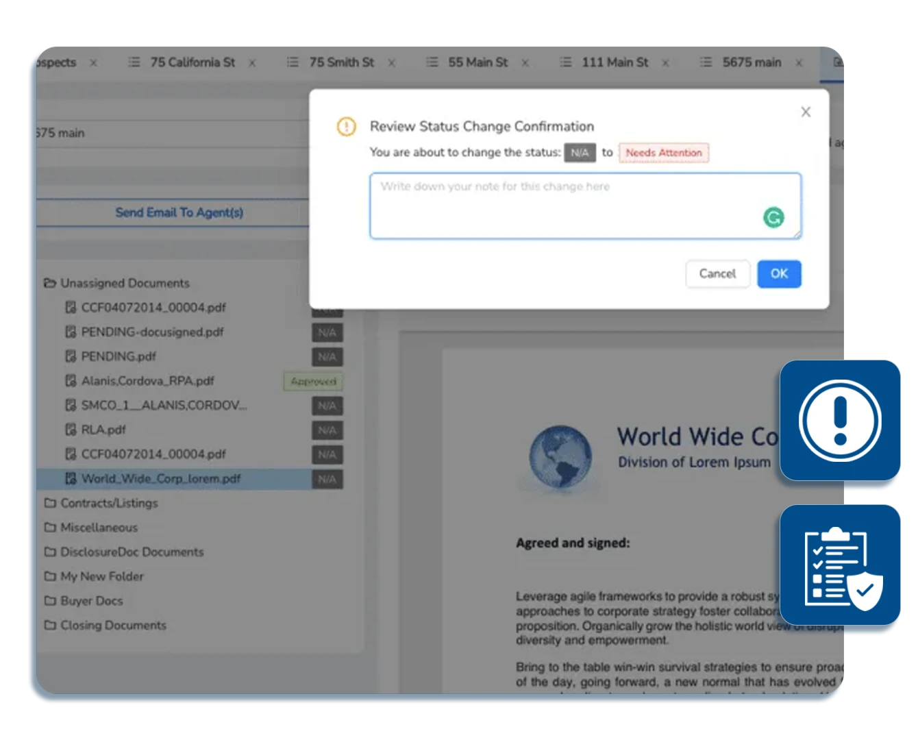 Easily review your documents for compliance, and once they are complete, mark them approved or send a note back to your agents for revisions.