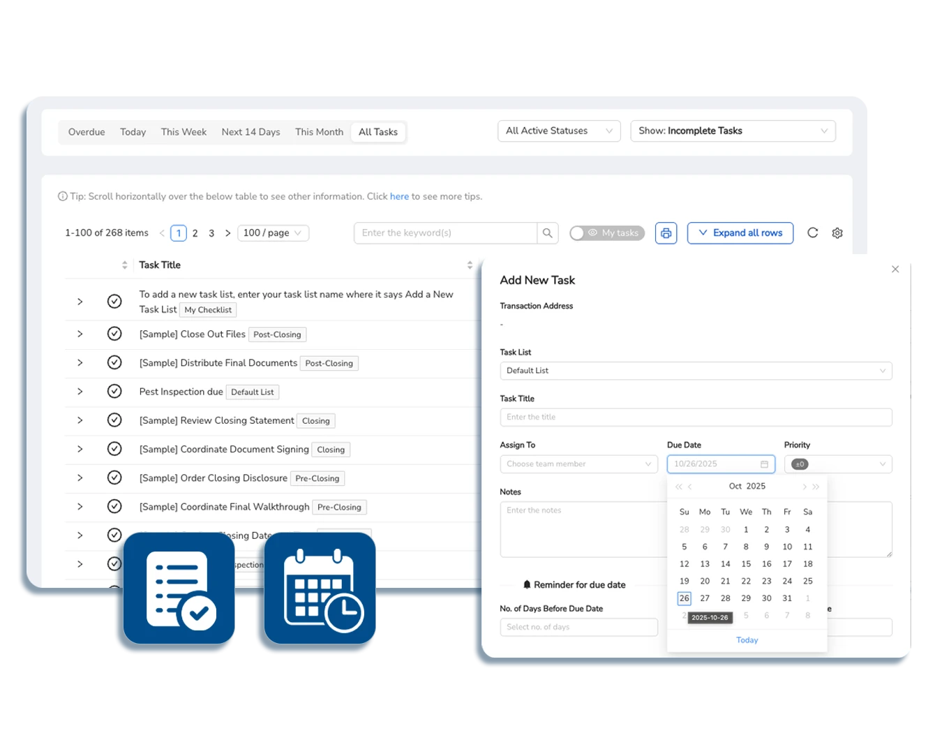 Apply task templates in one click. Our transaction coordination platform auto-generates tasks and assigns them to the right team members—saving time and reducing errors.